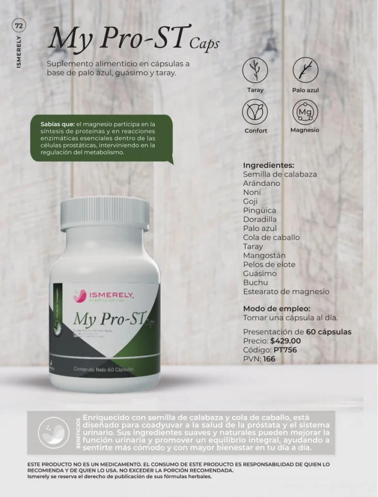 My Pro-ST Caps (Prostel) de Ismerely es un suplemento alimenticio natural diseñado para hombres que buscan cuidar su salud prostática y urinaria de manera integral.