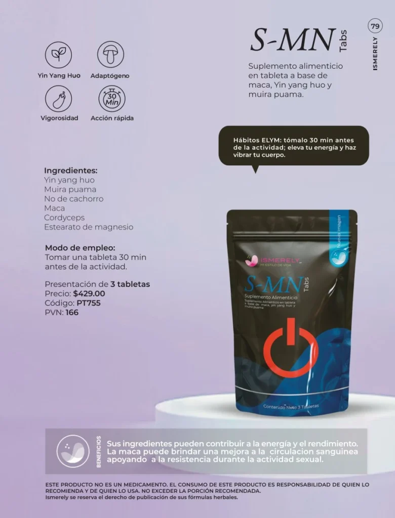 S-MN Tabs es una de las fórmulas más potentes y equilibradas de Ismerely en el área de energía y bienestar sexual.